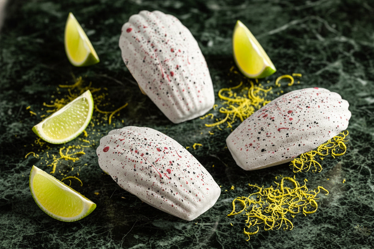 Black Sesame Yuzu Madeleine - Instagram's Favorite, thanks to its artsy and distinct Jackson Pollock's look! To be perfectly honest, it is also the most satisfying to make - Imagine us, usually late at night, in our commercial kitchen, with our brushes splashing dots at madeleine shells who didn't really ask for it! If you had a bad day, come make black Sesame madeleines with us...