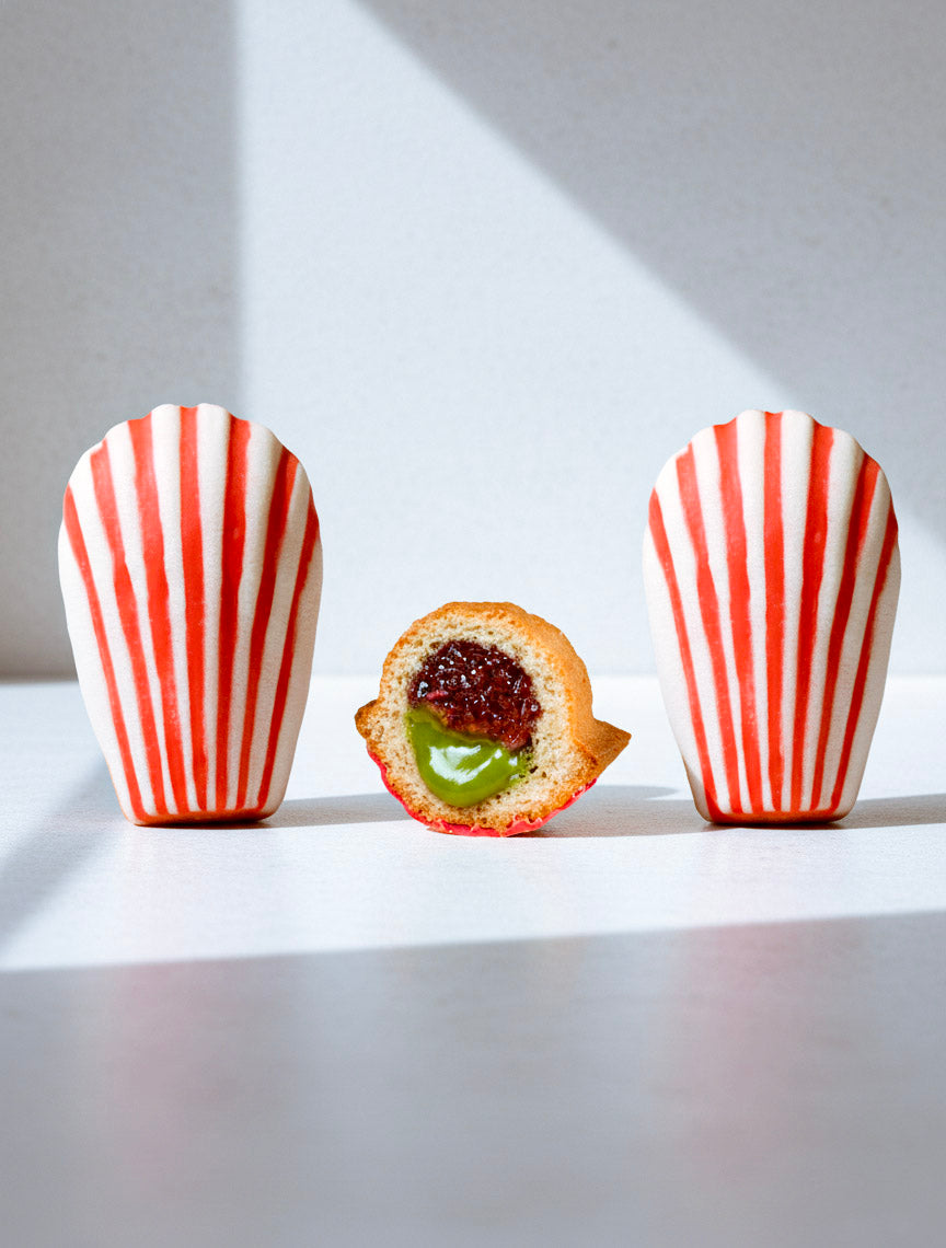 Matcha Strawberry Madeleine - Yao's Favorite: I don't make compromise when it comes to matcha so that's why we wanted to be all in with this one! I shopped around to find the Uji matcha that would give the most intense flavor when added in a creme pat' and balanced it with a touch of home-made strawberry jam.